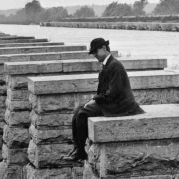 This image shows a well-dressed gentleman sitting on the opposite side of the aqueduct from the towpath.