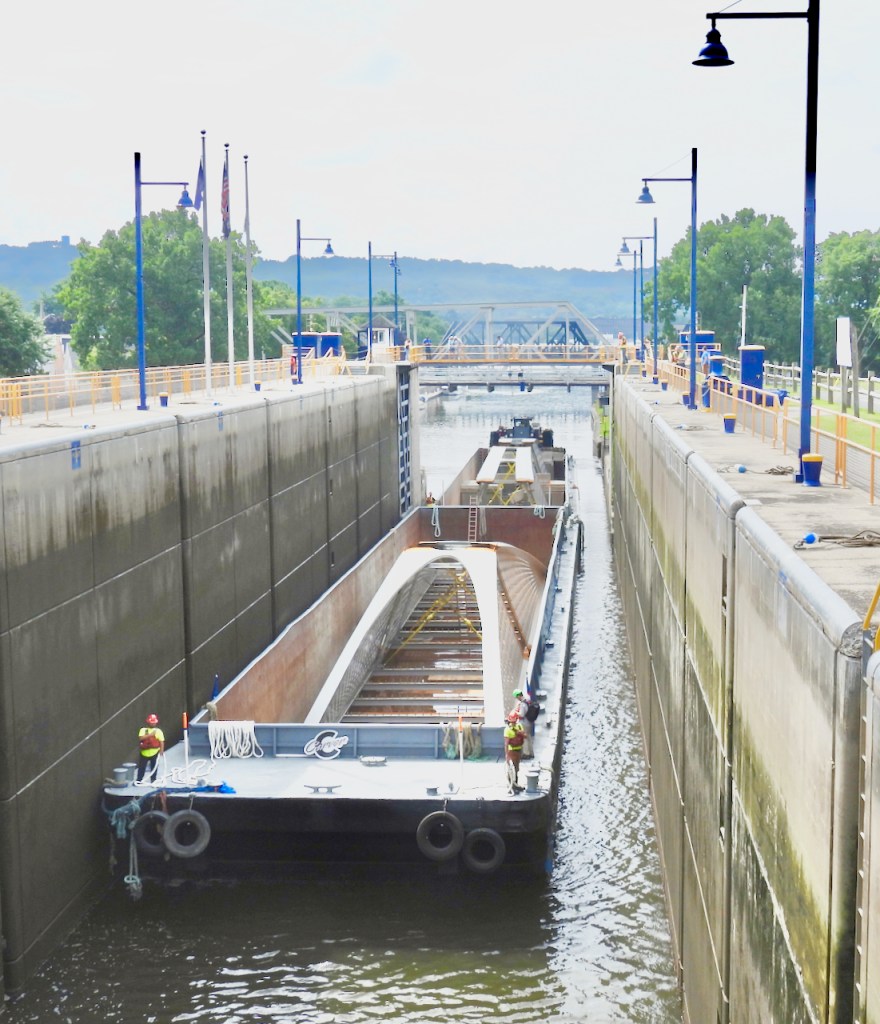 The 220 tons of oversize cargo was made up of sections of a bridge fabricated in Italy and bound for Buffalo, definitely not traveling by truck or train, and more cost-effective to transport by the NYS Canals.