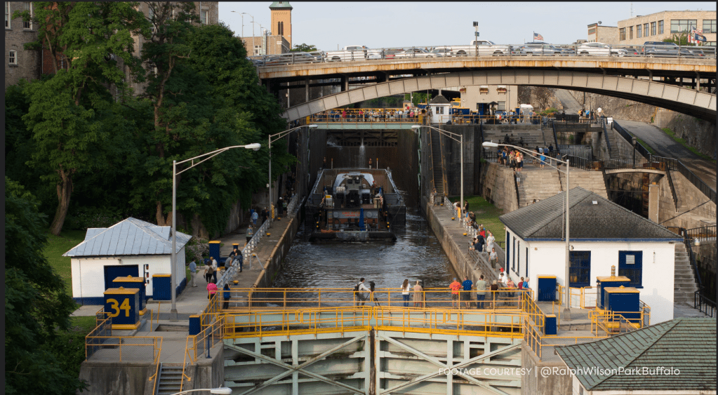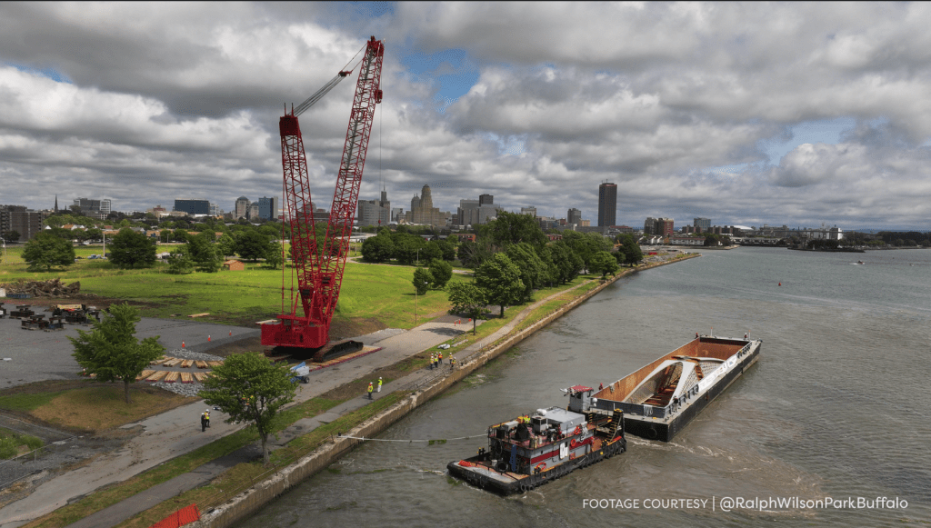 The final barge arrived in Buffalo yesterday, a crane immediately began the process of lifting the sections from the barges to the re-imagined LaSalle Park, now Ralph Wilson Park. CMT Otter and the two barges are already moving back east through the Canal for their next commerce. You can still catch it as it makes its way back to then Hudson River and waters beyond.