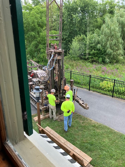 “Watch this space” is a message often seen at a construction site. After lots of exciting upcoming activity, replica canal schooner Lois McClure will be landing a permanent display home in the space below. The drilling for the crane placements and foundations for the McClure were done earlier this week. The engineers discovered dirt at the Erie House. Thank you to the Verdi family for letting us use their bulkhead on the canal.