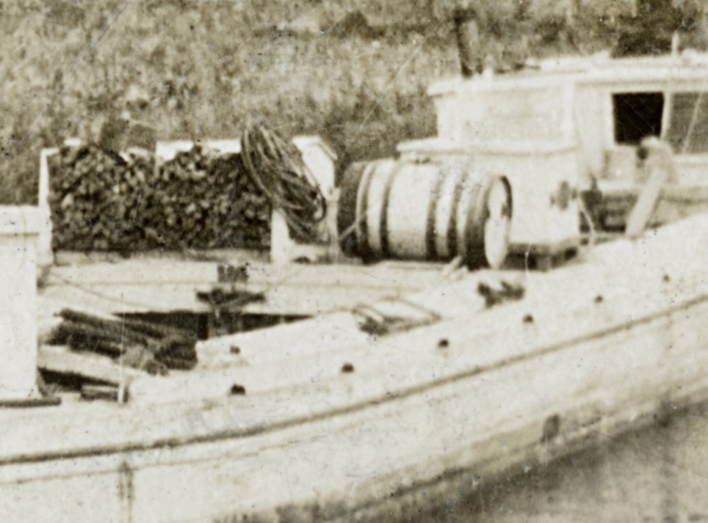 I’m not sure what cargo was in the hold, but the portion of the deck magnified below seems to be in disarray. I can make out a wooden barrel. Cargo? Beyond the barrel, is that a wood-burning cookstove? To the left, firewood?