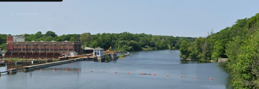 I put Google pegman on the County Road 57 bridge to report back on seeing a “semi-circular fixed crest ogee spillway and a curved sloping apron on the downstream face.” See page 6 here. He reported back that if you try hard enough, you can imagine all that, some distance beyond the row of orange safety buoys to warn boaters of the dangers of being swept over the dam. To the left, note the approach wall on the upstream side of lock O-5.