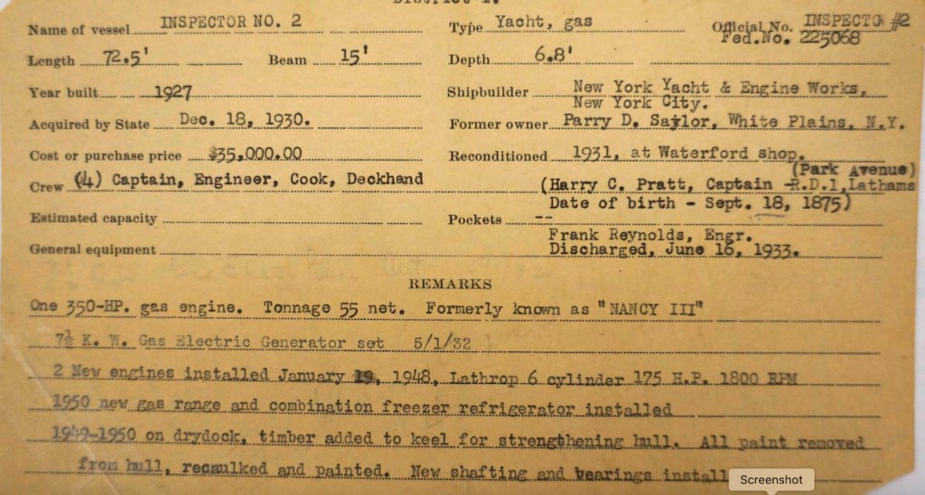 The 1927 vessel featured in this post, Inspector II, was part of the Barge Canal fleet from 1930 until at least 1957. Built as a single engine yacht, it was repowered as a twin screw yacht in 1948. Lots of other interesting details on the card below.
