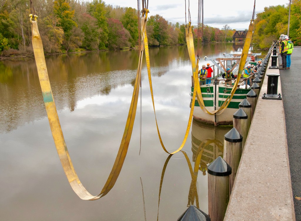 Replica canal schooner Lois McClure was successfully lifted from the water yesterday, and Tom Beardsley, Steve Boerner, and Bill Havens took so many great photos to document the evolution that I decided to do two posts on the lift. The water perspective was captured by Tom, and the view from land, by Steve and Bill. And I’ll alternate between the water and land views in the order they occurred.