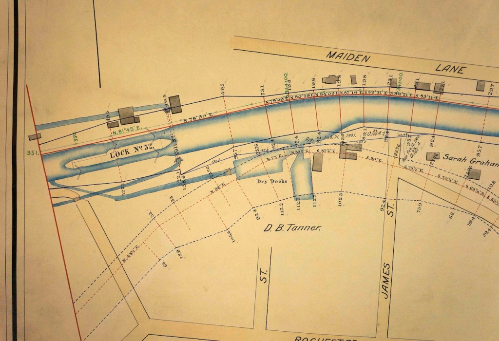 Click on the interactive map  of the same area below, and you can locate Erie Canal Lock 52, Maiden Lane, W Dock Street, and the Samuel Center all in their contemporary context.