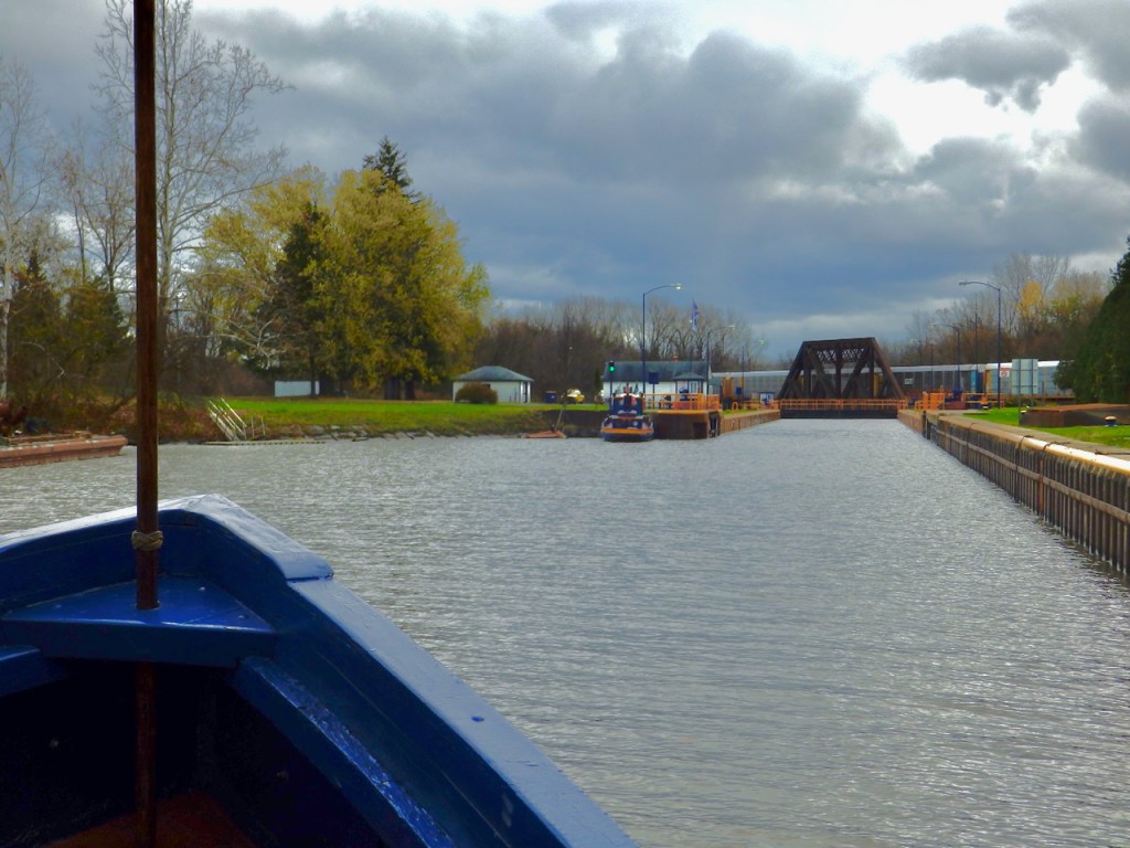 Urger approaches lock 14 in Palatine Bridge, where Governor Cleveland was docked.  The New York Thruway aka I-90 is off to the left and  busy railroad tracks to the right.
