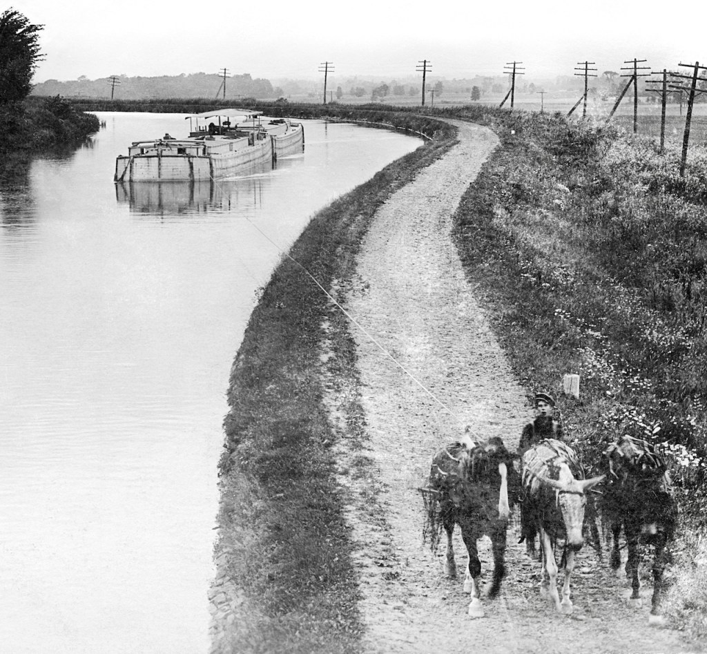 Several posts on Dispatches have featured a tugboat called Urger. On my other blog, several dozen dozen have included photos of the venerable boat. As old as Dornbos/Urger is, her predecessor was human, one of the many who did the work illustrated here, the young person walking along the towpath and urging the draft animals to do the same although under strain. Unfortunately we know nothing about this image: no location, no boat names or provenance or destination or cargo, no date exactly. And the young man, we know no name, birthplace, history.