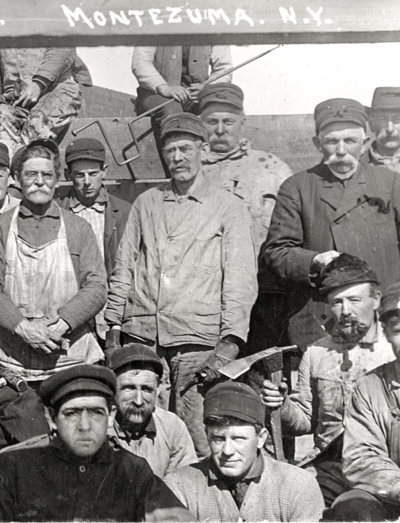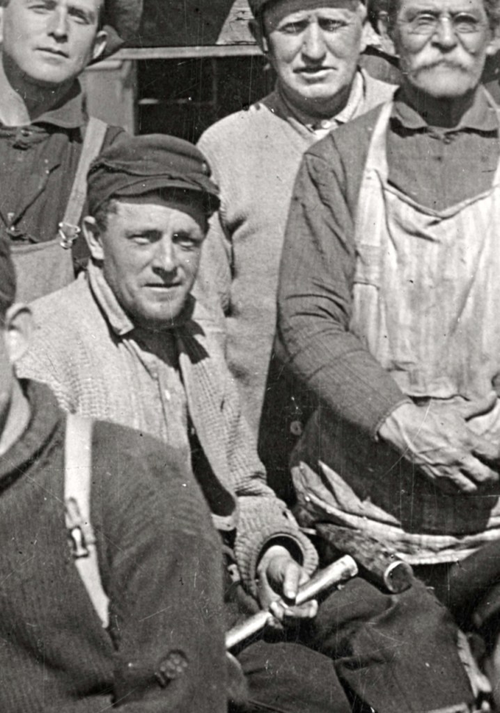 In this section of the image cleaned up by Bill Hecht are more exciting details:  the hand tools.  Judging from the location, I’d surmise this crew was building a wooden boat of some sort.  The smiling man to the left is holding a caulking mallet and chisel, used to pack oakum into seams in planking.  The men on either side of the one with a cigarette in his mouth are holding boring braces.