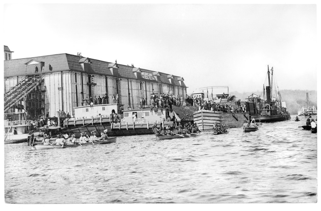Many thanks to Bill Hecht for cleaning up this intriguing image from the CSNY collection. I have an idea about the celebration, but I’ll save my understanding until the end of the post so that you can develop your own thoughts. It’s a busy image, lots going on, text on boats and the building in the center, incongruous combinations. Let’s walk through it.