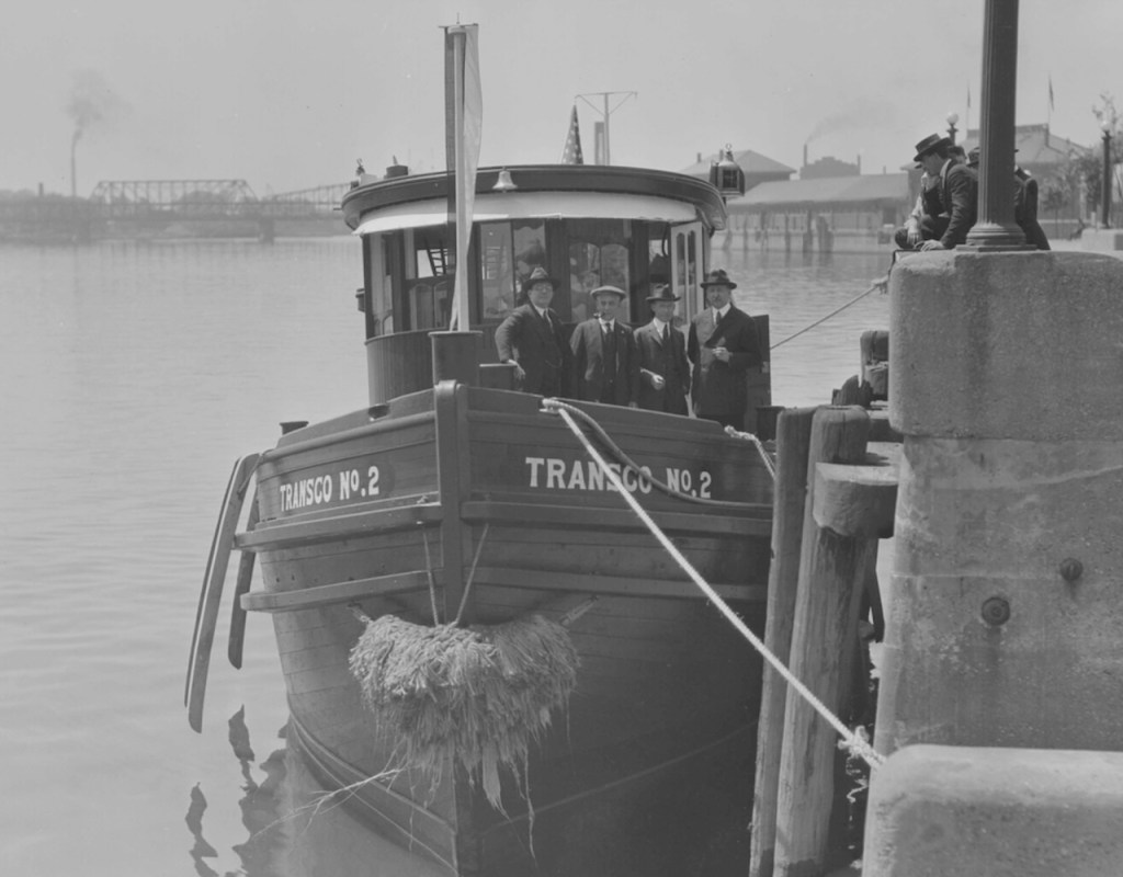 No work vests or hard hats, so I’d say this was an important event. Any guesses on the year? By the bridges in the background, I’d guess the location as Albany. The photo comes from the photo collections of the Canal society of New York.