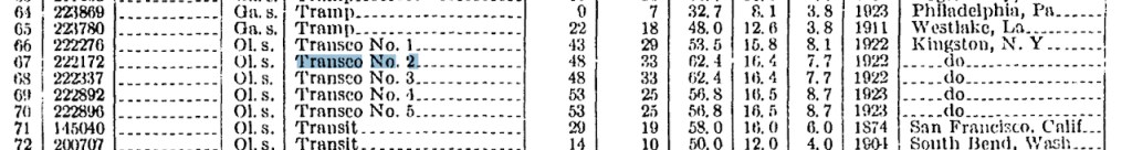 Here’s a screenshot from page 516 of Merchant Vessels of the United States. She’s one of five launched from an unidentified shipyard in Kingston NY. Her dimensions are 62.4′ x 16.4′ x 7.7′. Based on that, the two above photos could be from her christening in 1922.