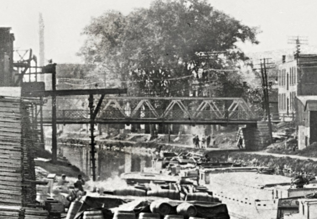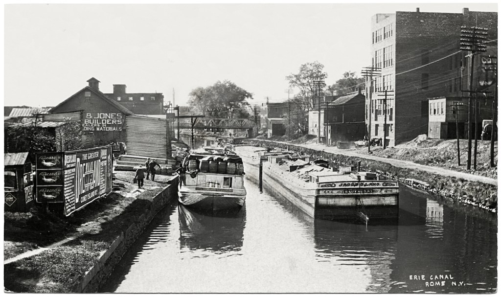 Let’s have a look around this photo identified as showing a portion of the Erie Canal in Rome NY. The double-barge to the right might have this Jacob Lang as namesake.