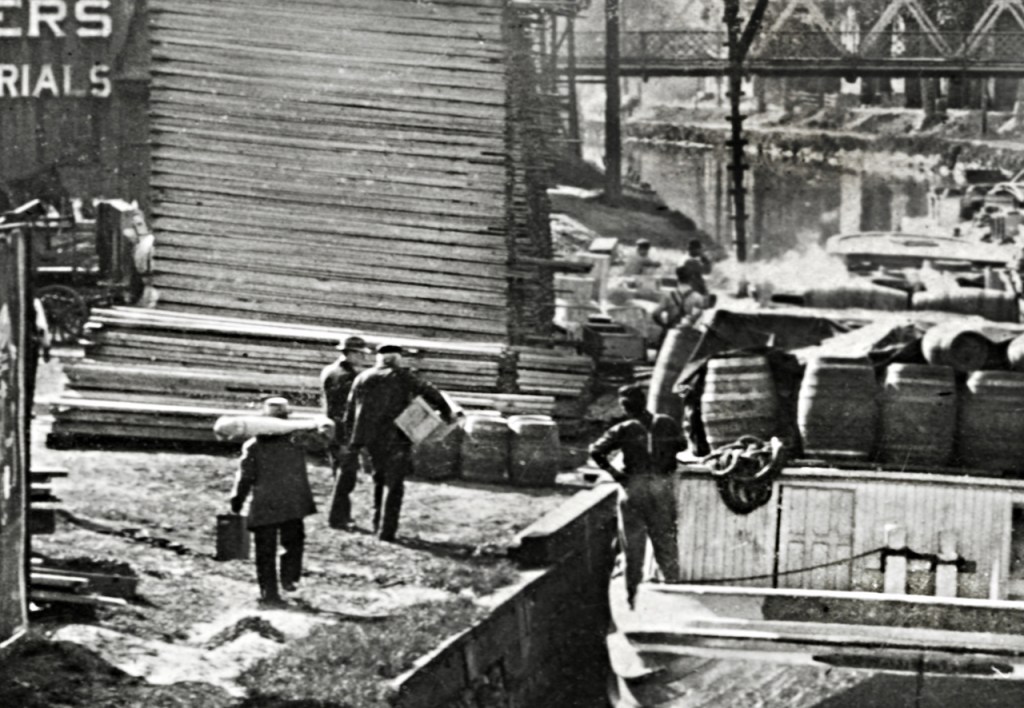 Here I see three men walking along the bank, two on the unnamed barge, and two more in the distance over beyond some of the building materials.