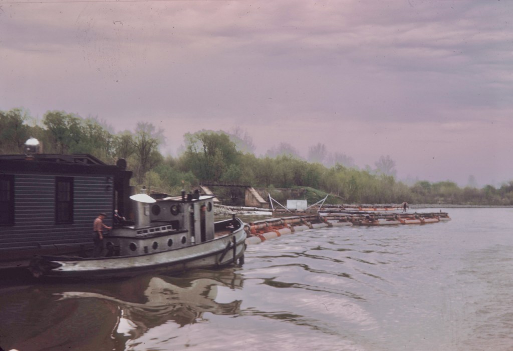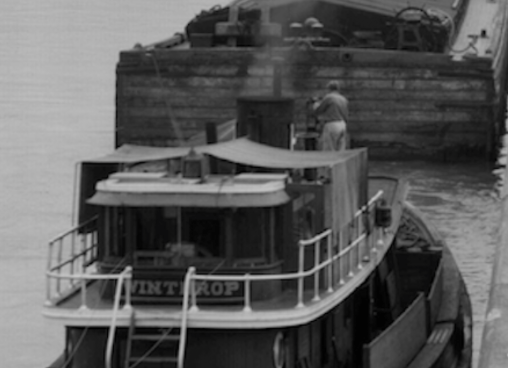 From the tugster blog comment by William Lafferty, here’s some info on Winthrop: “…really an oldie, built 1883 at Wilmington, Delaware, as J. Thos. Brown. As shown it was running for the W. E. Hedger Transportation Company of New York that ran a few very elderly steam tugs on the canal for a long time. Steam until the end, Winthrop dropped from documentation in 1954, sporting a 20” x 20” high pressure steam engine and leg boiler.” What might the crewman be doing behind the stack?