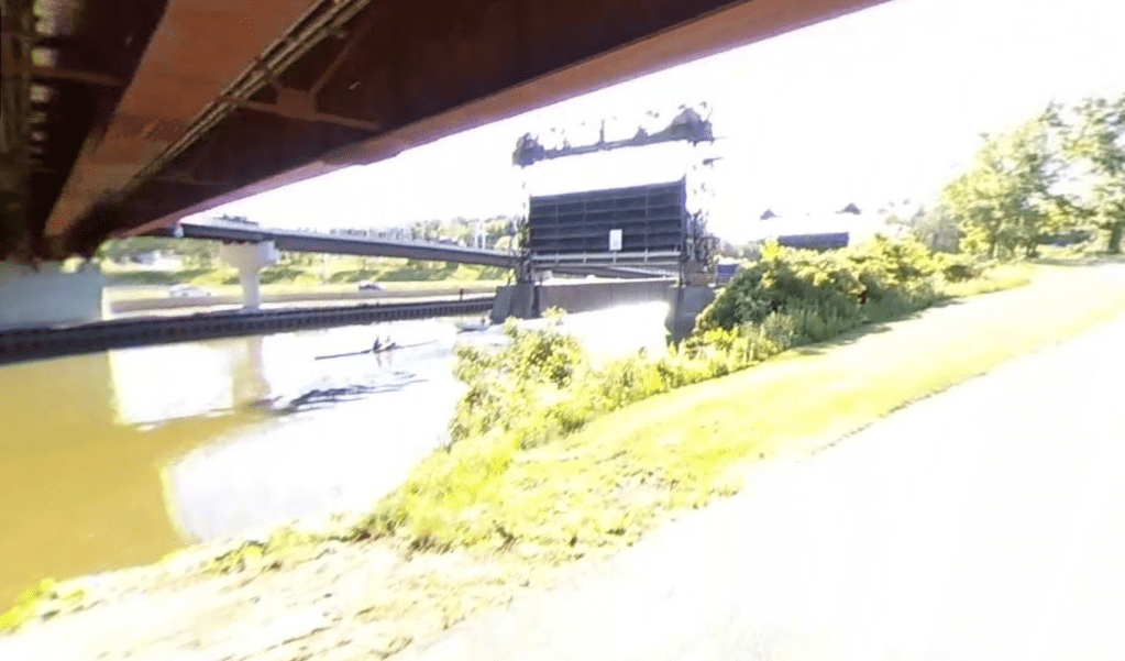 Today, as seen here from beneath the Kendrick Street Bridge, the bike path provides a green buffer between the canal and the settlement farther inland on either side. See the rowing scull?
