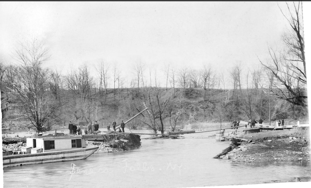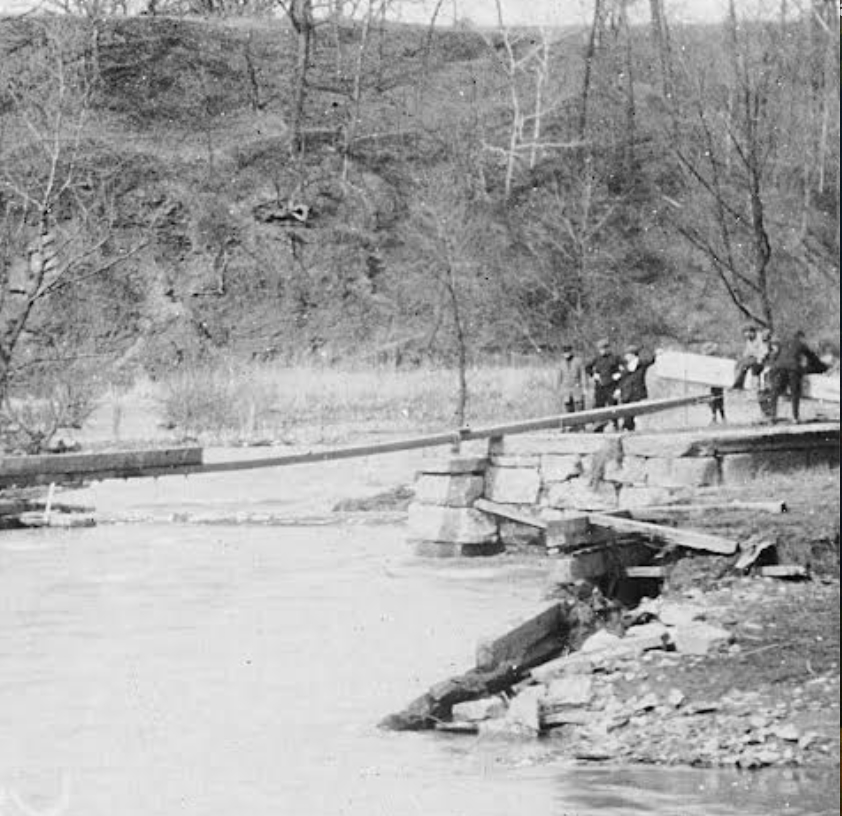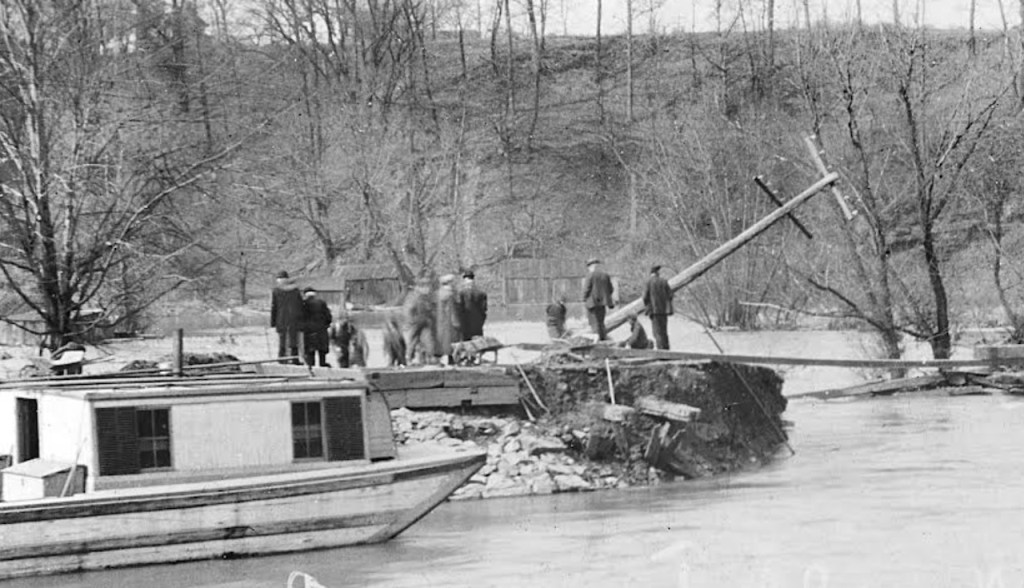 I don’t know if this is a post-washout scene, spring meltwaters going awry and taking out a bridge. No leaves adorn the trees, a utility pole askew nearly touches the bank, the banks on lower right look scoured by rushing water, and all those people appear to be surveying the scene.