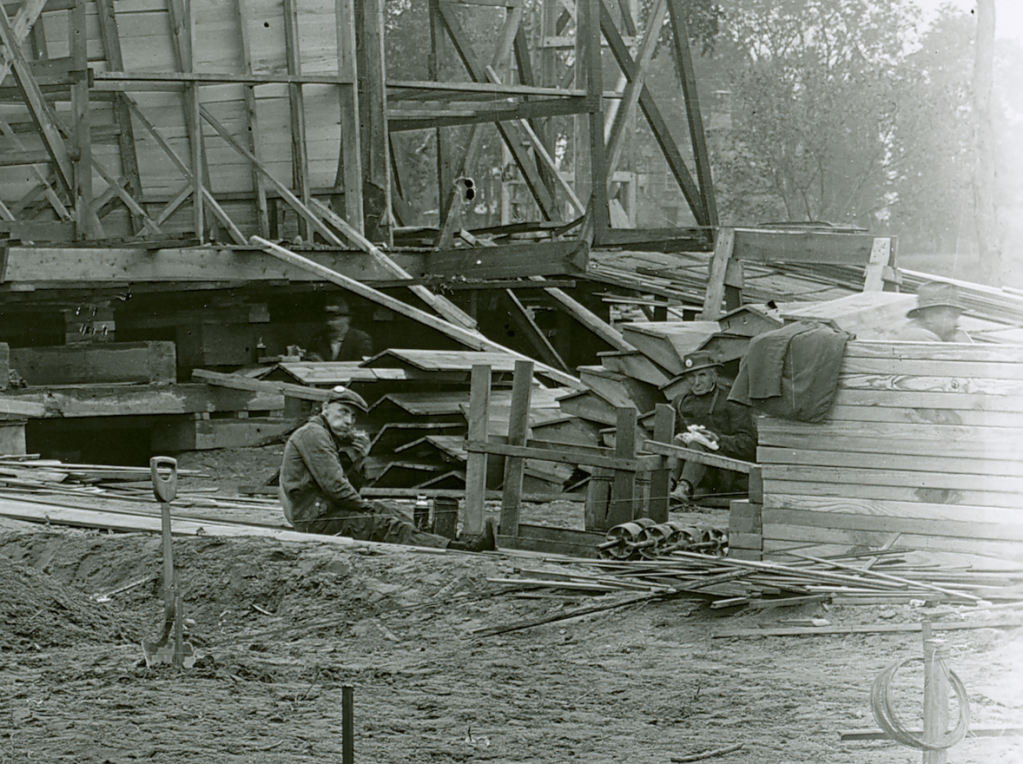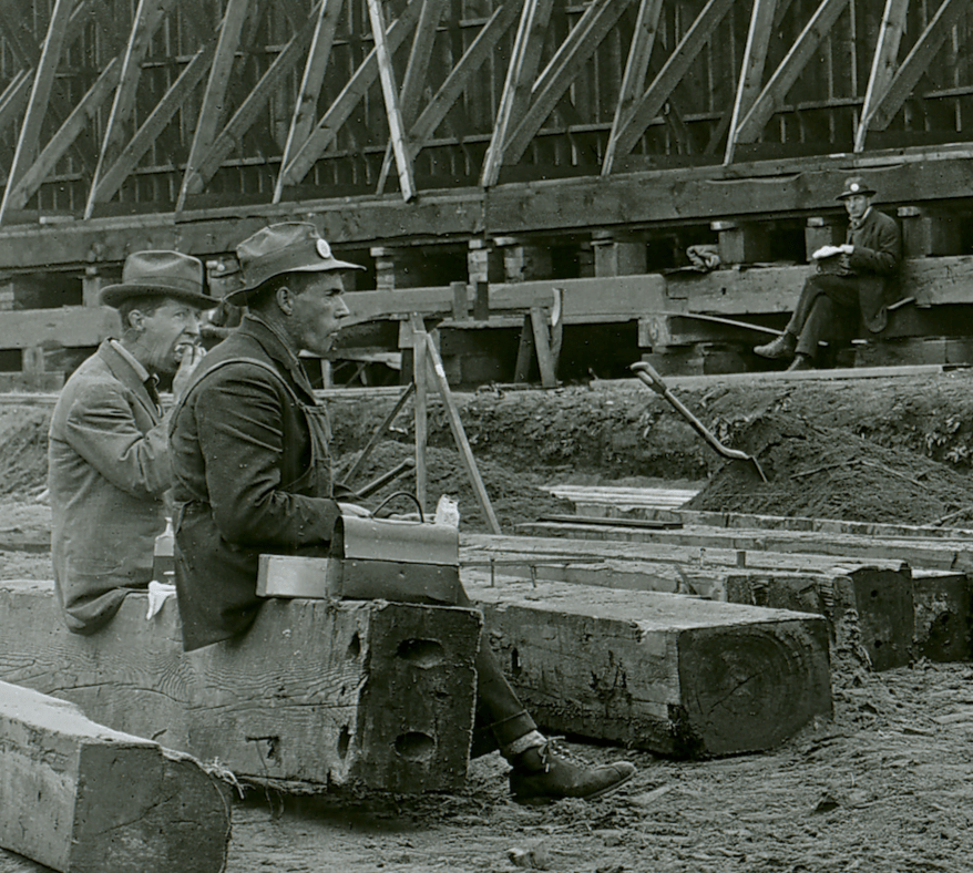 The sharpness of these images can be seen here, as these shipyard workers enjoy lunch on the job.