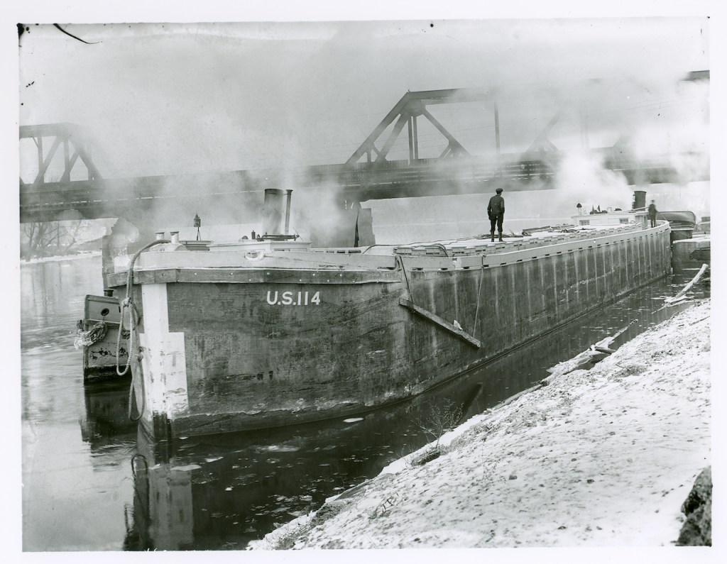 In this photo identified as Waterford, we see US 114 being assisted by unidentified steam tugboats, mone alongside and the other on the stern.