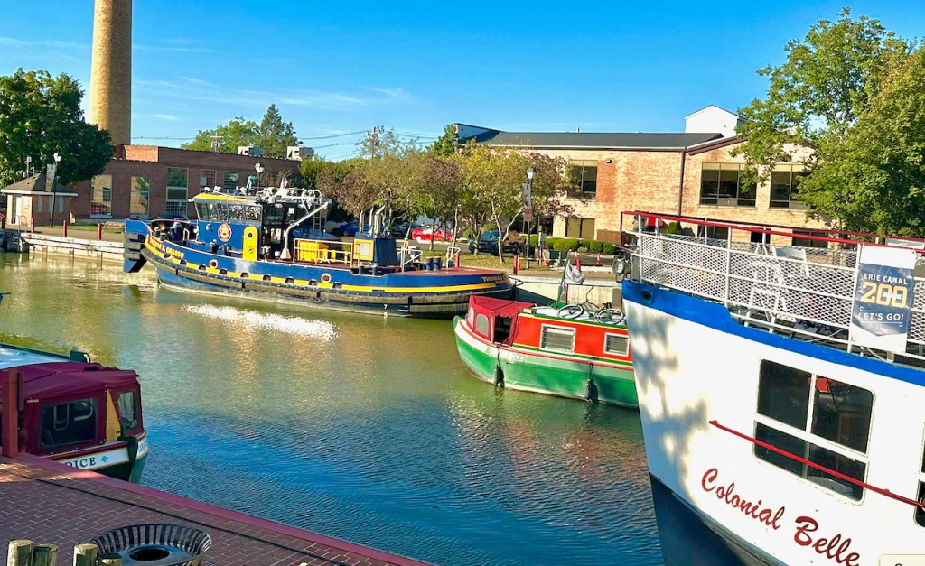 As Thomas X. Grasso made its way west, correspondents caught it in various locations. First, Bob Stopper sent this report from Lyons: “Lyons on the Erie Canal- another history making event: hot off the skids and first time on the Erie Canal- the historic and brand new NYS Canal tugboat docked this weekend (9.14.2025) at the Lyons Drydock wall adjacent Lock 28A. Destination is the forthcoming World Canal Conference in Buffalo.