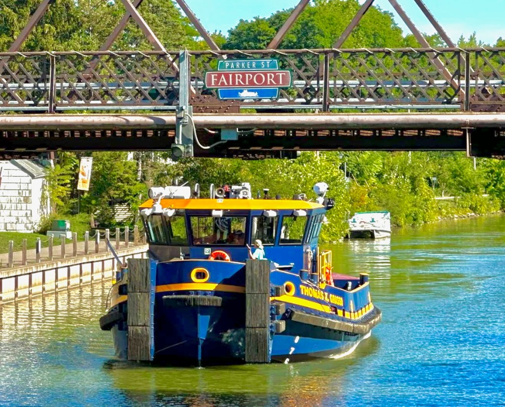 Later, from Fairport, Tammee Poinan Grimes sent this report: “Today, I had the privilege of seeing the arrival of the NYS Canal Corporation’s newest tug, the Thomas X. Grasso, in The Village of Fairport, NY, as the tug made a stop while en route to Buffalo for the upcoming World Canals Conference.