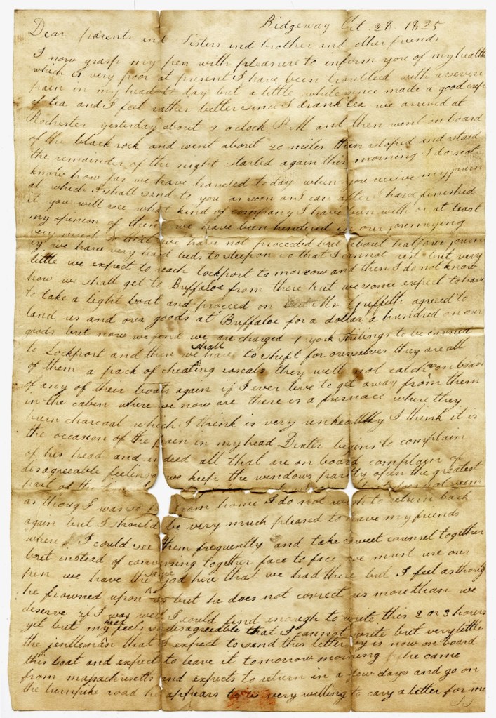 I now again write with pleasure to inform you of my health which is very poor at present. I have been troubled with a severe pain in my head for days but a little while since made a good cup of tea and I feel rather better since I drank tea. We arrived at Rochester yesterday about 2 o’clock P.M. and then went on board of the black rock [WVD boldface] and went about 20 miles then stopped and stayed the remainder of the night. Started again this morning. I do not know how far we have traveled today when you receive my letter, at which I shall send to you as soon as I can after I have finished it. You will see what kind of company I have been with at least my opinion of them. We have been hindered in our journeying very much so that we have not proceeded far, about half our journey. We have very hard beds to sleep on so that I cannot rest very little. We expect to reach Lockport tomorrow and then I do not know how we shall get to Buffalo from there but we some expect to take a light boat and proceed on. But Mr. [Gustill / Gustall / Gustett] agreed to land us and our goods at Buffalo for a dollar a hundred on our goods but now we find we are charged 1 year’s wharfage to be carried to Lockport and then we have to shift for ourselves. They are all of them a pack of cheating rascals. They would not take a barrel of any of their loads again if I ever live to get away from them.