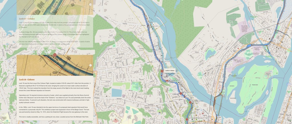 Let’s look at the 19th century canal locks in Albany County, the eastern end of the canal at that time. Double click on the image below to make it live, or interactive. Then you should be able to scroll through the lock and infrastructure viewer beginning with the cover and statewide New York map. As you scroll through, note the red dots indicating locks and other infrastructure. Then notice the information such as text, archival images, contemporary photos and more in the boxes to the left side of the screen. As you scroll through the boxes, the map area shown advances automatically.