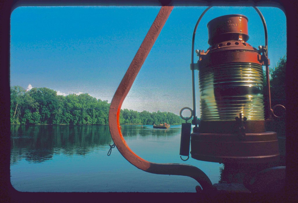 I don’t know if this photo was taken at lock 14 as well, but it uses the lantern to artfully frame the approaching tugboat and fuel barge.