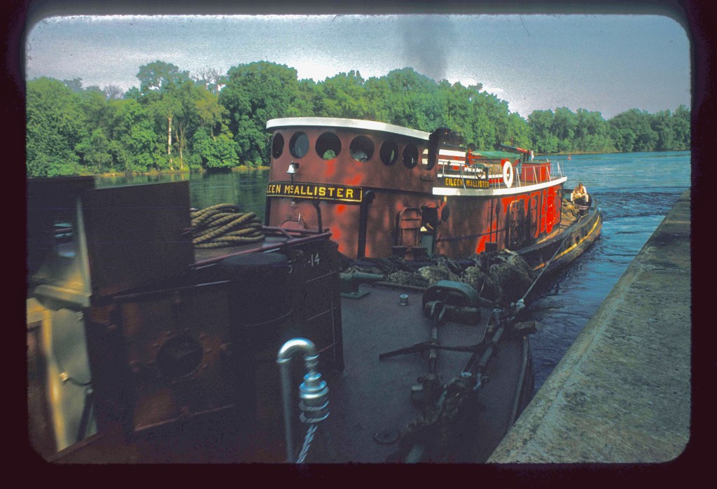 The tugboat is a classic, the 1907 Eileen McAllister. More on Eileen here. According to that link, she carried that name from 1952 until she sank in Maine in the 1980s.