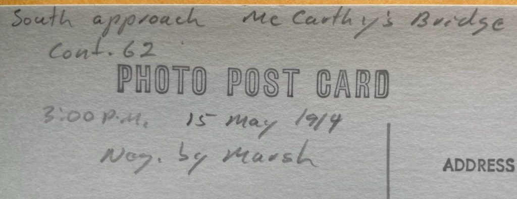 See the notation on the second image of this post. It identifies the photograph as Marsh and the location as McCarthy’s Bridge. My questions: is that bridge still standing? What car is that parked on the bridge? What are those other bridge spans and other structures (guard gate ends?) in the background?
