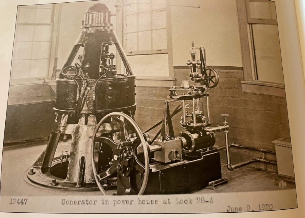 this room with the same equipment in 1920. When the Barge Canal opened in 1918, no AC power grid existed, so locks needed to generate their own power using water or some other source.